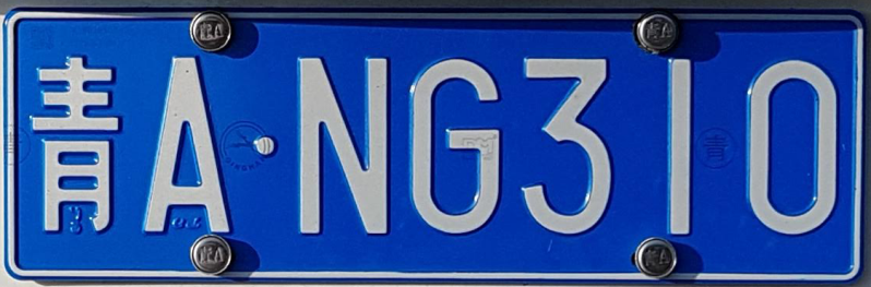 Op Chinese kentekenplaten staat het eerste Chinese karakter voor de provincie. In geval staat er 青 (Qing). Dat staat voor de provincie 青海 (Qinghai). Dat is een vrij dunbevolkte maar erg grote provincie in het midden van het land.De eerste letter na dat karakter staat voor de prefectuur of grote stad waar de auto vandaan komt. In dit geval staat er een 'A'. Dat staat voor Xining, de hoofdstad van Qinghai.