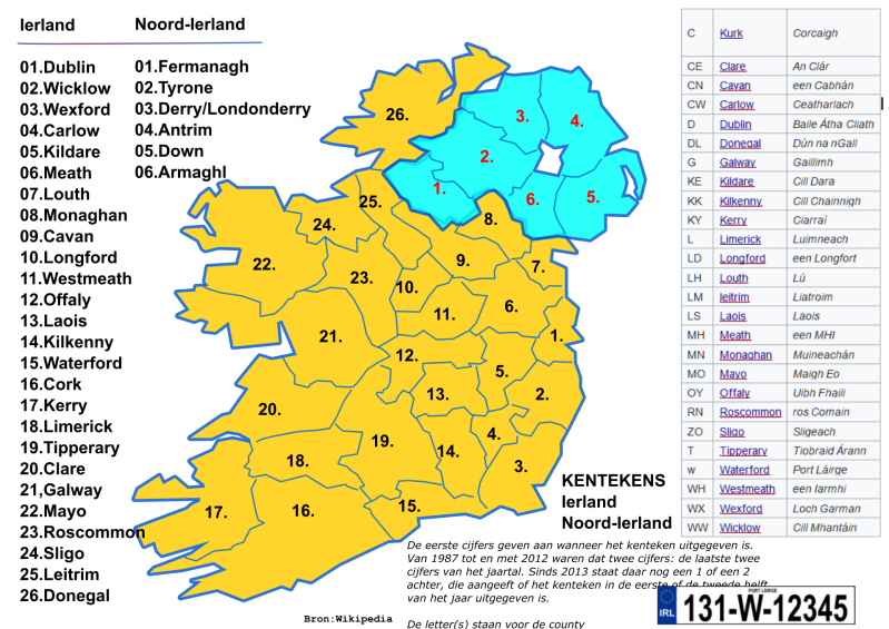 Een Iers kenteken begint met twee of drie cijfers, gevolgd door een of twee letters en daarna nog maximaal zes cijfers.
